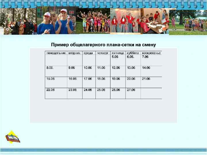 При составлении плана-сетки обязательно нужно учитывать следующие факторы: • специфику периода смены (организационный, основной, заключительный); • соотношение отрядных и общелагерных мероприятий; • длительность проведения мероприятий; • эмоциональную и физическую загруженность детей; • разнообразие и последовательное усложнение видов и форм, деятельности; • полезную направленность планируемых дел (социальную, педагогическую, психологическую и др. ); • резервы свободного времени ребенка.