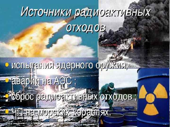 Радиоактивное загрязнение. В Мировой океан радиоактивные осадки попадают тремя путями: вопервых, из атмосферы в результате ядерных испытаний; вовторых, при сбросе радиоактивных вод и радиоактивных веществ с предприятий атомной промышленности и атомных электростанций и, наконец, в результате аварий судов, работающих на атомных двигателях, а также сброса радиоактивных отходов судовых реакторов.