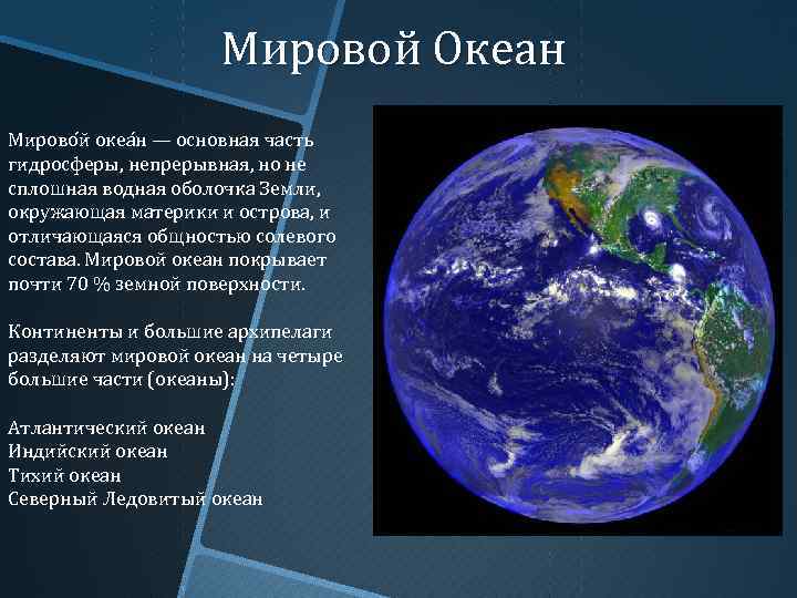 Мировой Океан Мирово й океа н — основная часть гидросферы, непрерывная, но не сплошная водная оболочка Земли, окружающая материки и острова, и отличающаяся общностью солевого состава. Мировой океан покрывает почти 70 % земной поверхности. Континенты и большие архипелаги разделяют мировой океан на четыре большие части (океаны): Атлантический океан Индийский океан Тихий океан Северный Ледовитый океан