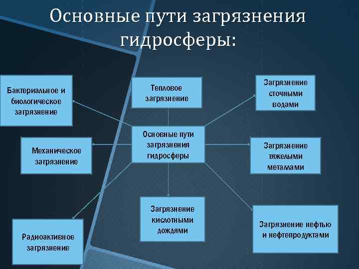 Основные пути загрязнения гидросферы: Бактериальное и биологическое загрязнение Механическое загрязнение Радиоактивное загрязнение Тепловое загрязнение Основные пути загрязнения гидросферы Загрязнение кислотными дождями Загрязнение сточными водами Загрязнение тяжелыми металлами Загрязнение нефтью и нефтепродуктами