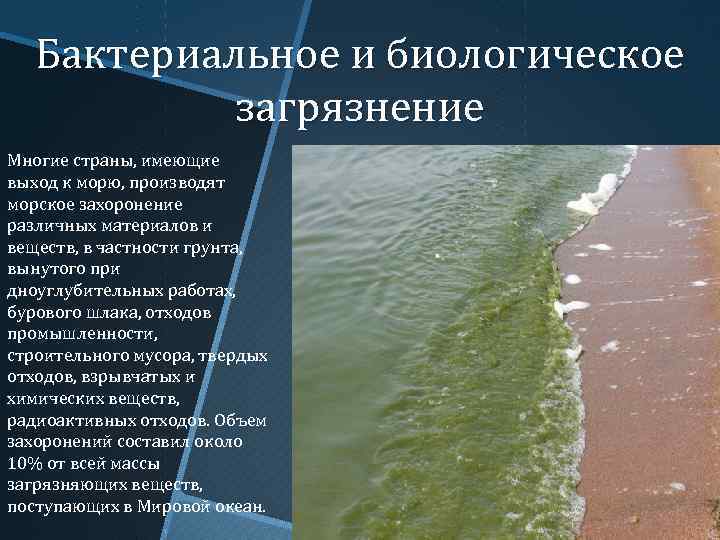 Бактериальное и биологическое загрязнение Многие страны, имеющие выход к морю, производят морское захоронение различных материалов и веществ, в частности грунта, вынутого при дноуглубительных работах, бурового шлака, отходов промышленности, строительного мусора, твердых отходов, взрывчатых и химических веществ, радиоактивных отходов. Объем захоронений составил около 10% от всей массы загрязняющих веществ, поступающих в Мировой океан.