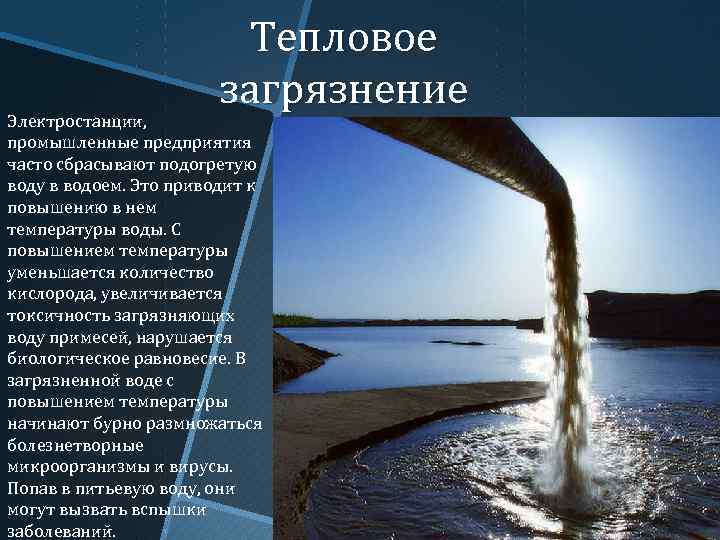 Тепловое загрязнение Электростанции, промышленные предприятия часто сбрасывают подогретую воду в водоем. Это приводит к повышению в нем температуры воды. С повышением температуры уменьшается количество кислорода, увеличивается токсичность загрязняющих воду примесей, нарушается биологическое равновесие. В загрязненной воде с повышением температуры начинают бурно размножаться болезнетворные микроорганизмы и вирусы. Попав в питьевую воду, они могут вызвать вспышки заболеваний.