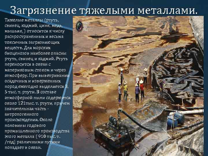 Загрязнение тяжелыми металлами. Тяжелые металлы (ртуть, свинец, кадмий, цинк, медь, мышьяк, ) относятся к числу распространенных и весьма токсичных загрязняющих веществ. Для морских биоценозов наиболее опасны ртуть, свинец и кадмий. Ртуть переносится в океан с материковым стоком и через атмосферу. При выветривании осадочных и изверженных пород ежегодно выделяется 3, 5 тыс. т. ртути. В составе атмосферной пыли содержится около 121 тыс. т. ртути, причем значительная часть антропогенного происхождения. Около половины годового промышленного производства этого металла ( 910 тыс. т. /год) различными путями попадает в океан.