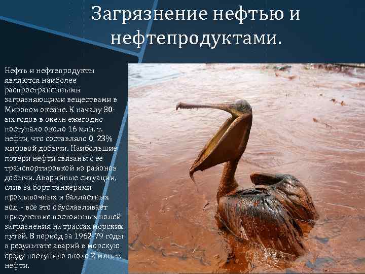 Загрязнение нефтью и нефтепродуктами. Нефть и нефтепродукты являются наиболее распространенными загрязняющими веществами в Мировом океане. К началу 80 ых годов в океан ежегодно поступало около 16 млн. т. нефти, что составляло 0, 23% мировой добычи. Наибольшие потери нефти связаны с ее транспортировкой из районов добычи. Аварийные ситуации, слив за борт танкерами промывочных и балластных вод, - все это обуславливает присутствие постоянных полей загрязнения на трассах морских путей. В период за 1962 -79 годы в результате аварий в морскую среду поступило около 2 млн. т. нефти.