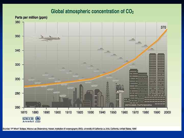 Многолетний режим погоды называется климатом Устойчивость климата есть проявление относительной геофизических, геохимических и биотических факторов стабильности Парниковые газы - двуокись углерода, водяной пар, метан, окислы азота, хлорфторуглероды и др. Парниковый эффект — это удержание значительной части тепловой энергии Солнца у земной поверхности. Важнейшим парниковым газом является двуокись углерода. Его основным источником служат процессы сжигания органического топлива. За счет этого в атмосферу поступает до 80% двуокиси углерода. По прогнозу на 2000 год, содержание СО 2 в атмосфере оценивалось в 0, 0394 %, и эта величина оказалась практически независимой от различных сценариев развития энергетики. При этом концентрация углекислоты должна возрасти на 30— 40 % по сравнению с 1960 г. Из модельных расчетов следует, что удвоение концентрации СО 2 влечет изменение средней температуры на 2— 3 градуса. Следующим по вкладу в парниковый эффект являются метан и закись азота.