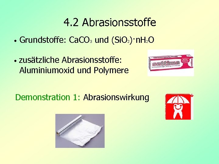 4. 2 Abrasionsstoffe • Grundstoffe: Ca. CO 3 und (Si. O 2)·n. H 2 O • zusätzliche Abrasionsstoffe: Aluminiumoxid und Polymere Demonstration 1: Abrasionswirkung