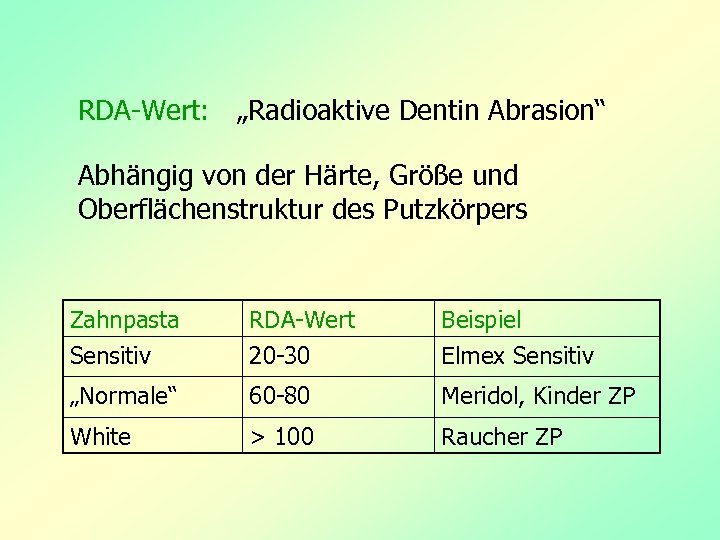 RDA-Wert: „Radioaktive Dentin Abrasion“ Abhängig von der Härte, Größe und Oberflächenstruktur des Putzkörpers Zahnpasta Sensitiv RDA-Wert 20 -30 Beispiel Elmex Sensitiv „Normale“ 60 -80 Meridol, Kinder ZP White > 100 Raucher ZP