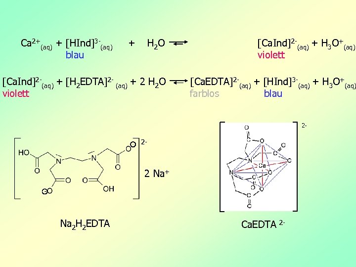 Ca 2+(aq) + [HInd]3 -(aq) blau + H 2 O [Ca. Ind]2 -(aq) + H 3 O+(aq) violett [Ca. Ind]2 -(aq) + [H 2 EDTA]2 - (aq) + 2 H 2 O violett [Ca. EDTA]2 -(aq) + [HInd]3 -(aq) + H 3 O+(aq) farblos blau 2 - 2 - 2 Na+ Na 2 H 2 EDTA Ca. EDTA 2 -