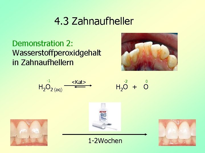 4. 3 Zahnaufheller Demonstration 2: Wasserstoffperoxidgehalt in Zahnaufhellern -1 H 2 O 2 (aq) <Kat> -2 0 H 2 O + O 1 -2 Wochen