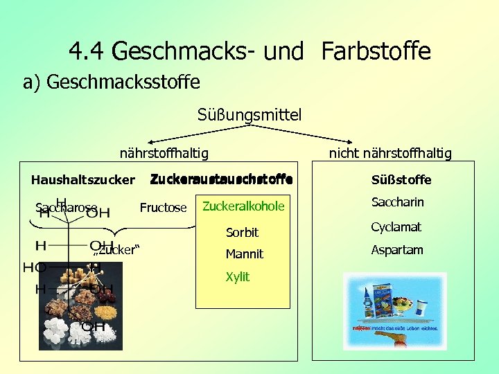 4. 4 Geschmacks- und Farbstoffe a) Geschmacksstoffe Süßungsmittel nährstoffhaltig nicht nährstoffhaltig Zuckeraustauschstoffe Haushaltszucker Süßstoffe Fructose „Zucker“ Zuckeralkohole Saccharin Sorbit Saccharose Cyclamat Mannit Aspartam Xylit