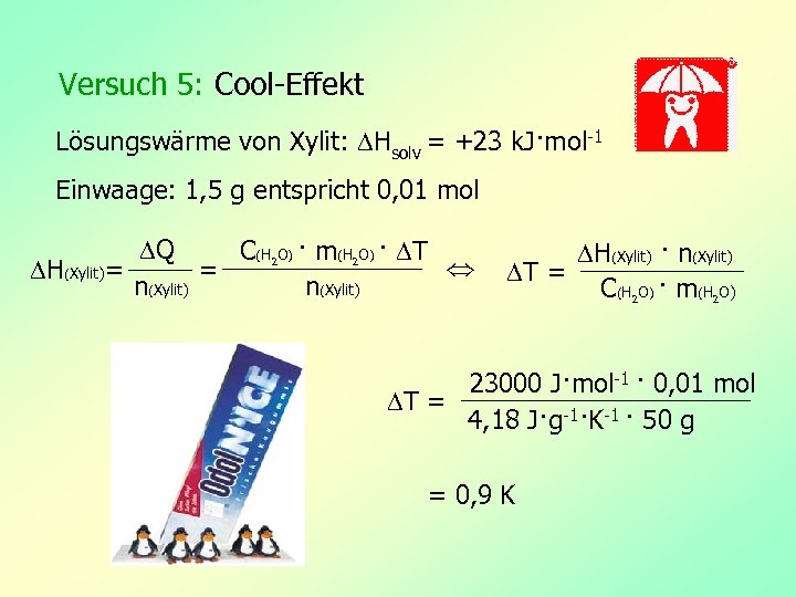 Versuch 5: Cool-Effekt Lösungswärme von Xylit: Hsolv = +23 k. J·mol-1 Einwaage: 1, 5 g entspricht 0, 01 mol Q C(H O) · m(H O) · T = H(Xylit)= n(Xylit) 2 2 H(Xylit) · n(Xylit) T = C(H O) · m(H O) 2 2 23000 J·mol-1 · 0, 01 mol T = 4, 18 J·g-1·K-1 · 50 g = 0, 9 K