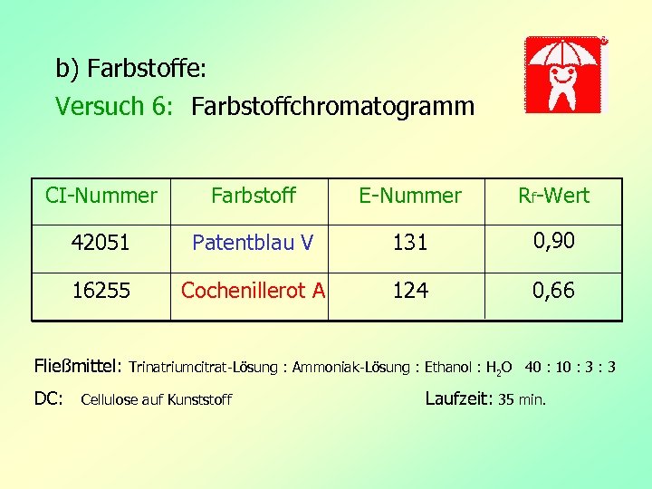 b) Farbstoffe: Versuch 6: Farbstoffchromatogramm CI-Nummer Farbstoff E-Nummer Rf-Wert 42051 Patentblau V 131 0, 90 16255 Cochenillerot A 124 0, 66 Fließmittel: DC: Trinatriumcitrat-Lösung : Ammoniak-Lösung : Ethanol : H 2 O 40 : 10 : 3 Cellulose auf Kunststoff Laufzeit: 35 min.