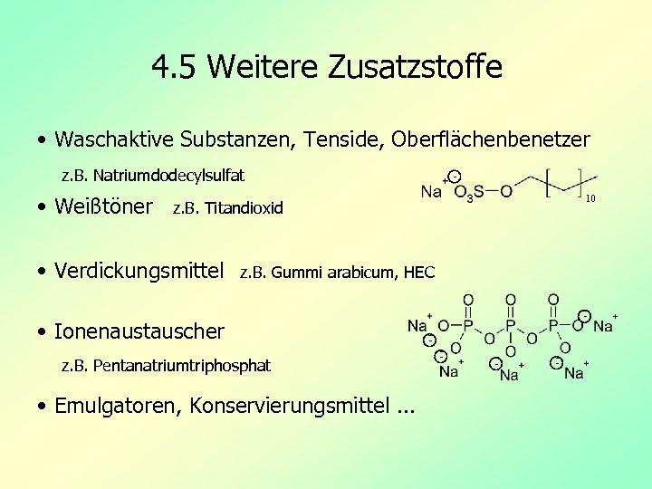 4. 5 Weitere Zusatzstoffe • Waschaktive Substanzen, Tenside, Oberflächenbenetzer z. B. Natriumdodecylsulfat • Weißtöner 10 z. B. Titandioxid • Verdickungsmittel z. B. Gummi arabicum, HEC - • Ionenaustauscher z. B. Pentanatriumtriphosphat • Emulgatoren, Konservierungsmittel. . . - - - - -