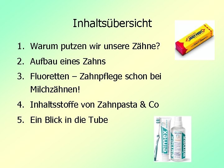 Inhaltsübersicht 1. Warum putzen wir unsere Zähne? 2. Aufbau eines Zahns 3. Fluoretten – Zahnpflege schon bei Milchzähnen! 4. Inhaltsstoffe von Zahnpasta & Co 5. Ein Blick in die Tube