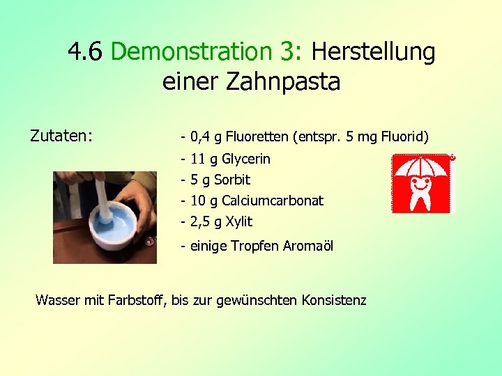 4. 6 Demonstration 3: Herstellung einer Zahnpasta Zutaten: - 0, 4 g Fluoretten (entspr. 5 mg Fluorid) - 11 g Glycerin - 5 g Sorbit - 10 g Calciumcarbonat - 2, 5 g Xylit - einige Tropfen Aromaöl Wasser mit Farbstoff, bis zur gewünschten Konsistenz