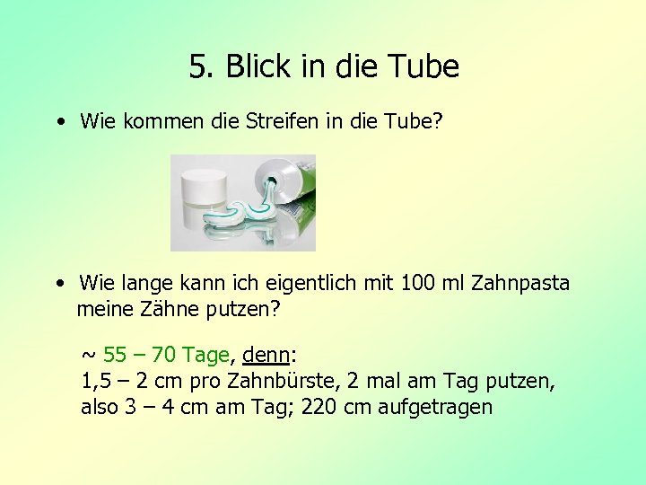 5. Blick in die Tube • Wie kommen die Streifen in die Tube? • Wie lange kann ich eigentlich mit 100 ml Zahnpasta meine Zähne putzen? ~ 55 – 70 Tage, denn: 1, 5 – 2 cm pro Zahnbürste, 2 mal am Tag putzen, also 3 – 4 cm am Tag; 220 cm aufgetragen
