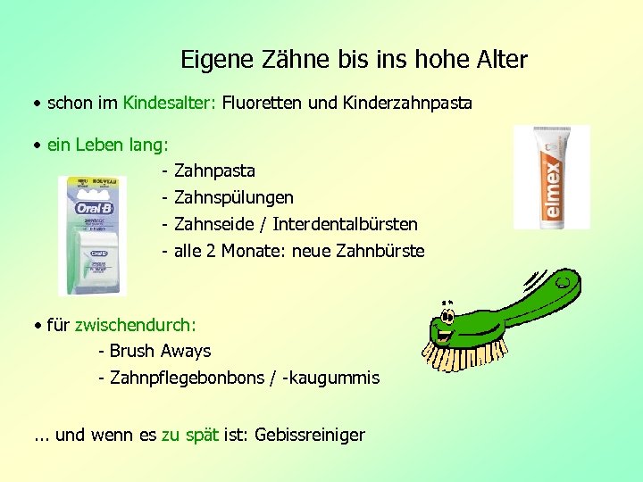 Eigene Zähne bis ins hohe Alter • schon im Kindesalter: Fluoretten und Kinderzahnpasta • ein Leben lang: - Zahnpasta Zahnspülungen Zahnseide / Interdentalbürsten alle 2 Monate: neue Zahnbürste • für zwischendurch: - Brush Aways - Zahnpflegebonbons / -kaugummis. . . und wenn es zu spät ist: Gebissreiniger