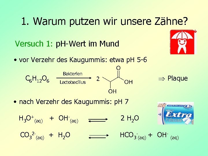 1. Warum putzen wir unsere Zähne? Versuch 1: p. H-Wert im Mund • vor Verzehr des Kaugummis: etwa p. H 5 -6 C 6 H 12 O 6 Bakterien Lactobacillus Plaque 2 • nach Verzehr des Kaugummis: p. H 7 H 3 O+(aq) + OH-(aq) 2 H 2 O CO 32 -(aq) + H 2 O HCO 3 -(aq) + OH- (aq)