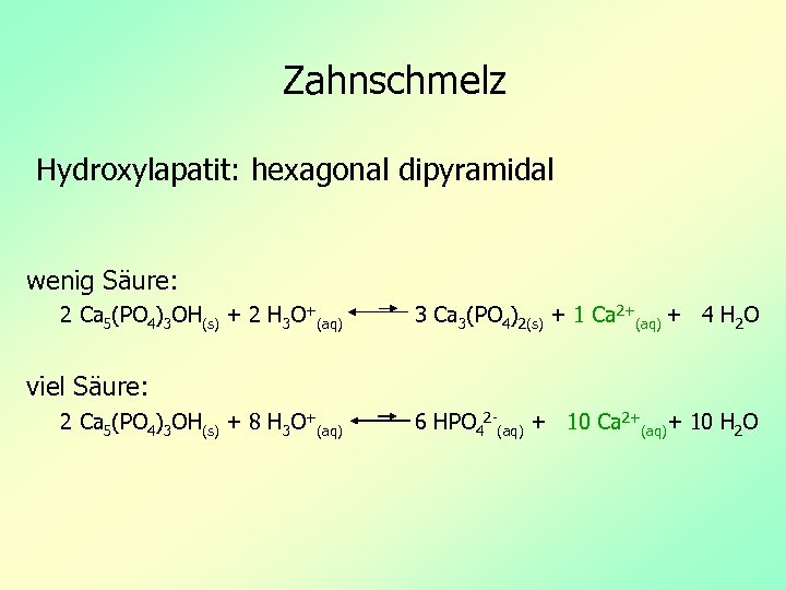 Zahnschmelz Hydroxylapatit: hexagonal dipyramidal wenig Säure: 2 Ca 5(PO 4)3 OH(s) + 2 H 3 O+(aq) 3 Ca 3(PO 4)2(s) + 1 Ca 2+(aq) + 4 H 2 O viel Säure: 2 Ca 5(PO 4)3 OH(s) + 8 H 3 O+(aq) 6 HPO 42 -(aq) + 10 Ca 2+(aq)+ 10 H 2 O