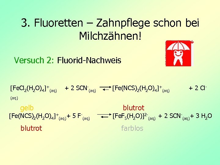 3. Fluoretten – Zahnpflege schon bei Milchzähnen! Versuch 2: Fluorid-Nachweis [Fe. Cl 2(H 2 O)4]+(aq) + 2 SCN-(aq) [Fe(NCS)2(H 2 O)4]+(aq) + 2 Cl- (aq) gelb [Fe(NCS)2(H 2 O)4]+(aq)+ 5 F-(aq) blutrot [Fe. F 5(H 2 O)]2 -(aq) + 2 SCN-(aq)+ 3 H 2 O farblos