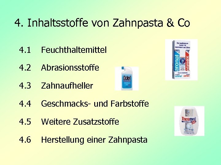 4. Inhaltsstoffe von Zahnpasta & Co 4. 1 Feuchthaltemittel 4. 2 Abrasionsstoffe 4. 3 Zahnaufheller 4. 4 Geschmacks- und Farbstoffe 4. 5 Weitere Zusatzstoffe 4. 6 Herstellung einer Zahnpasta