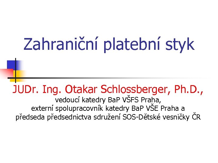 Zahraniční platební styk JUDr. Ing. Otakar Schlossberger, Ph. D. , vedoucí katedry Ba. P VŠFS Praha, externí spolupracovník katedry Ba. P VŠE Praha a předsednictva sdružení SOS-Dětské vesničky ČR