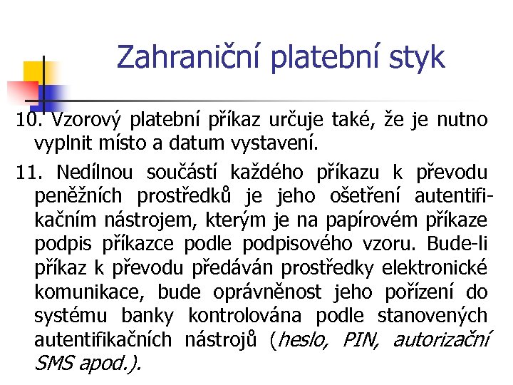 Zahraniční platební styk 10. Vzorový platební příkaz určuje také, že je nutno vyplnit místo a datum vystavení. 11. Nedílnou součástí každého příkazu k převodu peněžních prostředků je jeho ošetření autentifikačním nástrojem, kterým je na papírovém příkaze podpis příkazce podle podpisového vzoru. Bude-li příkaz k převodu předáván prostředky elektronické komunikace, bude oprávněnost jeho pořízení do systému banky kontrolována podle stanovených autentifikačních nástrojů (heslo, PIN, autorizační SMS apod. ).