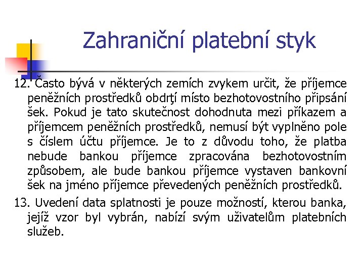 Zahraniční platební styk 12. Často bývá v některých zemích zvykem určit, že příjemce peněžních prostředků obdrţí místo bezhotovostního připsání šek. Pokud je tato skutečnost dohodnuta mezi příkazem a příjemcem peněžních prostředků, nemusí být vyplněno pole s číslem účtu příjemce. Je to z důvodu toho, že platba nebude bankou příjemce zpracována bezhotovostním způsobem, ale bude bankou příjemce vystaven bankovní šek na jméno příjemce převedených peněžních prostředků. 13. Uvedení data splatnosti je pouze možností, kterou banka, jejíž vzor byl vybrán, nabízí svým uživatelům platebních služeb.