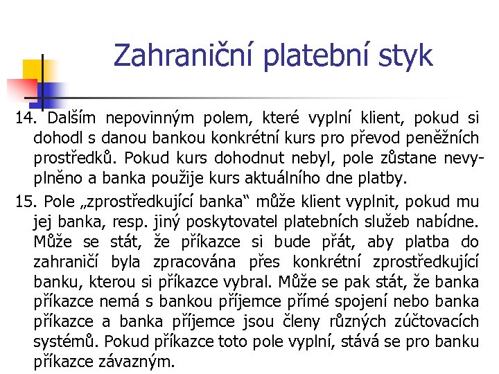 Zahraniční platební styk 14. Dalším nepovinným polem, které vyplní klient, pokud si dohodl s danou bankou konkrétní kurs pro převod peněžních prostředků. Pokud kurs dohodnut nebyl, pole zůstane nevyplněno a banka použije kurs aktuálního dne platby. 15. Pole „zprostředkující banka“ může klient vyplnit, pokud mu jej banka, resp. jiný poskytovatel platebních služeb nabídne. Může se stát, že příkazce si bude přát, aby platba do zahraničí byla zpracována přes konkrétní zprostředkující banku, kterou si příkazce vybral. Může se pak stát, že banka příkazce nemá s bankou příjemce přímé spojení nebo banka příkazce a banka příjemce jsou členy různých zúčtovacích systémů. Pokud příkazce toto pole vyplní, stává se pro banku příkazce závazným.