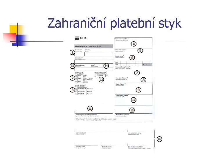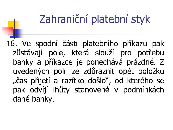 Zahraniční platební styk 16. Ve spodní části platebního příkazu pak zůstávají pole, která slouží pro potřebu banky a příkazce je ponechává prázdné. Z uvedených polí lze zdůraznit opět položku „čas přijetí a razítko došlo“, od kterého se pak odvíjí lhůty stanovené v podmínkách dané banky.