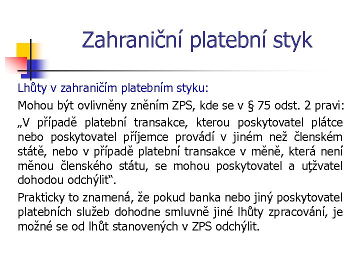 Zahraniční platební styk Lhůty v zahraničím platebním styku: Mohou být ovlivněny zněním ZPS, kde se v § 75 odst. 2 pravi: „V případě platební transakce, kterou poskytovatel plátce nebo poskytovatel příjemce provádí v jiném než členském státě, nebo v případě platební transakce v měně, která není měnou členského státu, se mohou poskytovatel a uţžvatel dohodou odchýlit“. Prakticky to znamená, že pokud banka nebo jiný poskytovatel platebních služeb dohodne smluvně jiné lhůty zpracování, je možné se od lhůt stanovených v ZPS odchýlit.