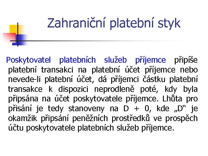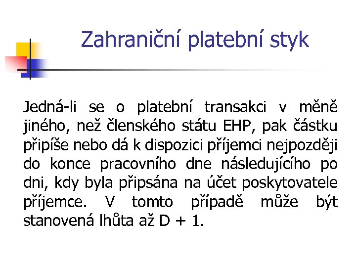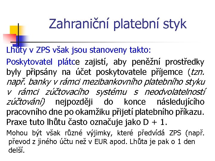 Zahraniční platební styk Lhůty v ZPS však jsou stanoveny takto: Poskytovatel plátce zajistí, aby peněžní prostředky byly připsány na účet poskytovatele příjemce (tzn. např. banky v rámci mezibankovního platebního styku v rámci zúčtovacího systému s neodvolatelností zúčtování) nejpozději do konce následujícího pracovního dne po okamžiku přijetí platebního příkazu. Praxe tuto lhůtu často označuje jako D + 1. Mohou být však různé výjimky, které předvídá ZPS (např. převod z jiného účtu než v EUR apod. Lhůta je pak o 1 den delší.