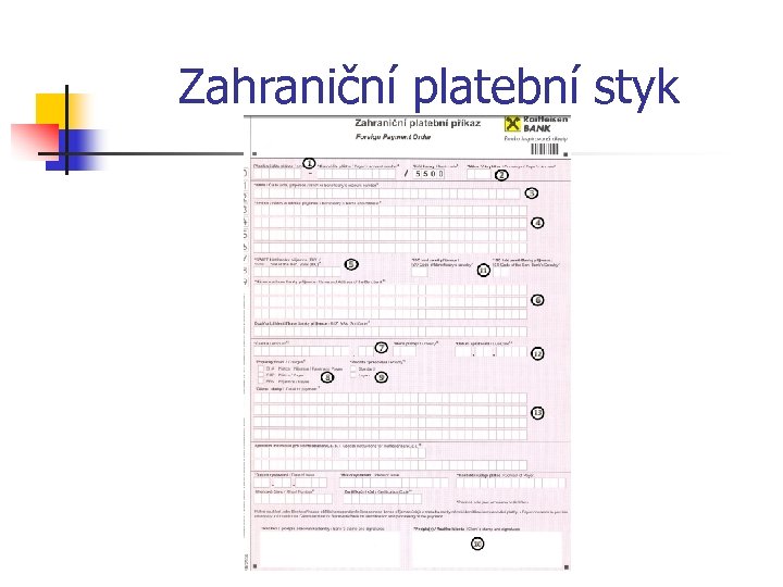 Zahraniční platební styk 5. Povinnou náležitostí příkazu k převodu do zahraničí je číslo účtu plátce, které nemusela mít formu IBAN. Protože však byla publikována obecně závazná právní norma, která hovoří o stanovení čísel účtů, s účinností této vyhlášky by pole mělo obsahovat mezinárodní tvar čísla účtu, kterým je IBAN. Banky a další finanční instituce, které budou stát v roli příjemce platby, berou číslo účtu plátce jako pravidlo, které si stanoví daná země, pokud vyhovuje pravidlům přenosového systému (kterým je zejména systém SWIFT). Lze však také akceptovat názor, že uvedená vyhláška upravuje pravidla stanovení čísla účtu pouze ve vnitrostátním a přeshraničním platebním styku.