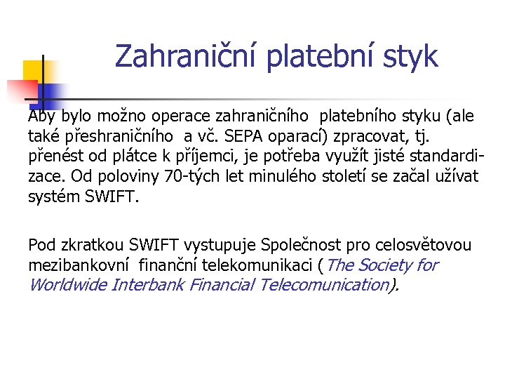 Zahraniční platební styk Aby bylo možno operace zahraničního platebního styku (ale také přeshraničního a vč. SEPA oparací) zpracovat, tj. přenést od plátce k příjemci, je potřeba využít jisté standardizace. Od poloviny 70 -tých let minulého století se začal užívat systém SWIFT. Pod zkratkou SWIFT vystupuje Společnost pro celosvětovou mezibankovní finanční telekomunikaci (The Society for Worldwide Interbank Financial Telecomunication).