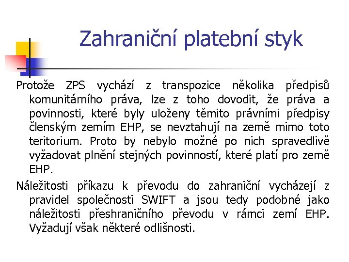 Zahraniční platební styk Protože ZPS vychází z transpozice několika předpisů komunitárního práva, lze z toho dovodit, že práva a povinnosti, které byly uloženy těmito právními předpisy členským zemím EHP, se nevztahují na země mimo toto teritorium. Proto by nebylo možné po nich spravedlivě vyžadovat plnění stejných povinností, které platí pro země EHP. Náležitosti příkazu k převodu do zahraniční vycházejí z pravidel společnosti SWIFT a jsou tedy podobné jako náležitosti přeshraničního převodu v rámci zemí EHP. Vyžadují však některé odlišnosti.