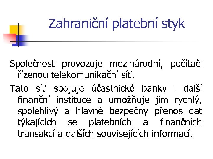 Zahraniční platební styk Společnost provozuje mezinárodní, počítači řízenou telekomunikační síť. Tato síť spojuje účastnické banky i další finanční instituce a umožňuje jim rychlý, spolehlivý a hlavně bezpečný přenos dat týkajících se platebních a finančních transakcí a dalších souvisejících informací.