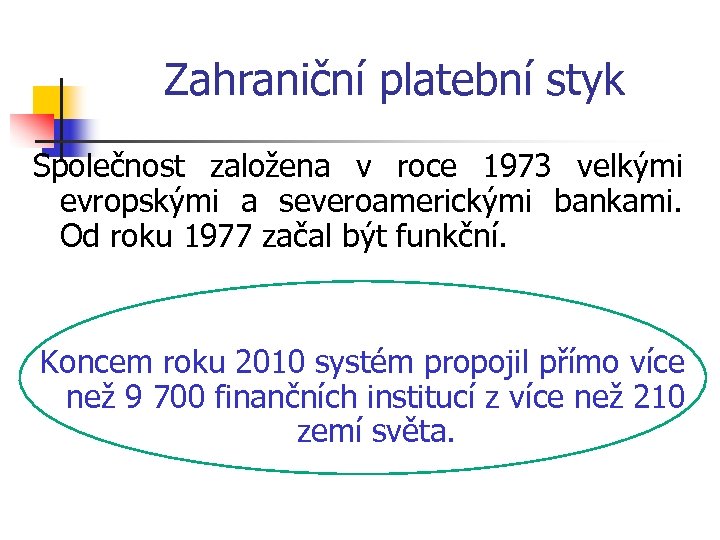 Zahraniční platební styk Společnost založena v roce 1973 velkými evropskými a severoamerickými bankami. Od roku 1977 začal být funkční. Koncem roku 2010 systém propojil přímo více než 9 700 finančních institucí z více než 210 zemí světa.