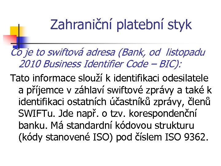 Zahraniční platební styk Co je to swiftová adresa (Bank, od listopadu 2010 Business Identifier Code – BIC): Tato informace slouží k identifikaci odesilatele a příjemce v záhlaví swiftové zprávy a také k identifikaci ostatních účastníků zprávy, členů SWIFTu. Jde např. o tzv. korespondenční banku. Má standardní kódovou strukturu (kódy stanovené ISO) pod číslem ISO 9362.