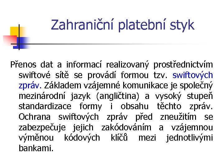 Zahraniční platební styk Přenos dat a informací realizovaný prostřednictvím swiftové sítě se provádí formou tzv. swiftových zpráv. Základem vzájemné komunikace je společný mezinárodní jazyk (angličtina) a vysoký stupeň standardizace formy i obsahu těchto zpráv. Ochrana swiftových zpráv před zneužitím se zabezpečuje jejich zakódováním a vzájemnou výměnou kódových klíčů mezi jednotlivými bankami.