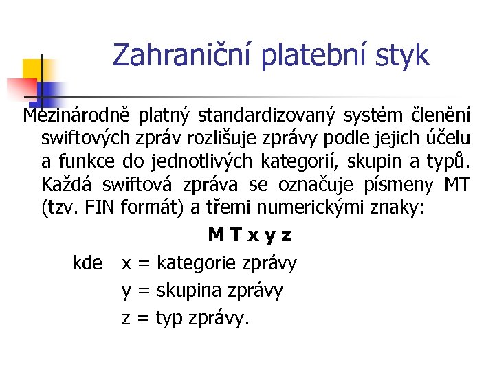 Zahraniční platební styk Mezinárodně platný standardizovaný systém členění swiftových zpráv rozlišuje zprávy podle jejich účelu a funkce do jednotlivých kategorií, skupin a typů. Každá swiftová zpráva se označuje písmeny MT (tzv. FIN formát) a třemi numerickými znaky: MTxyz kde x = kategorie zprávy y = skupina zprávy z = typ zprávy.