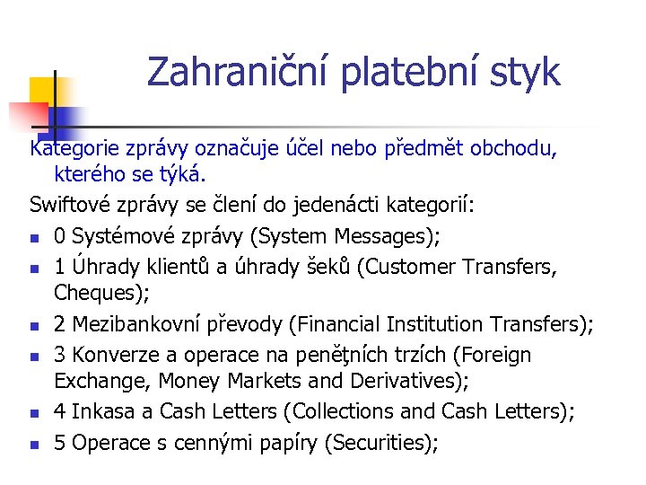 Zahraniční platební styk Kategorie zprávy označuje účel nebo předmět obchodu, kterého se týká. Swiftové zprávy se člení do jedenácti kategorií: n 0 Systémové zprávy (System Messages); n 1 Úhrady klientů a úhrady šeků (Customer Transfers, Cheques); n 2 Mezibankovní převody (Financial Institution Transfers); n 3 Konverze a operace na peněţních trzích (Foreign Exchange, Money Markets and Derivatives); n 4 Inkasa a Cash Letters (Collections and Cash Letters); n 5 Operace s cennými papíry (Securities);