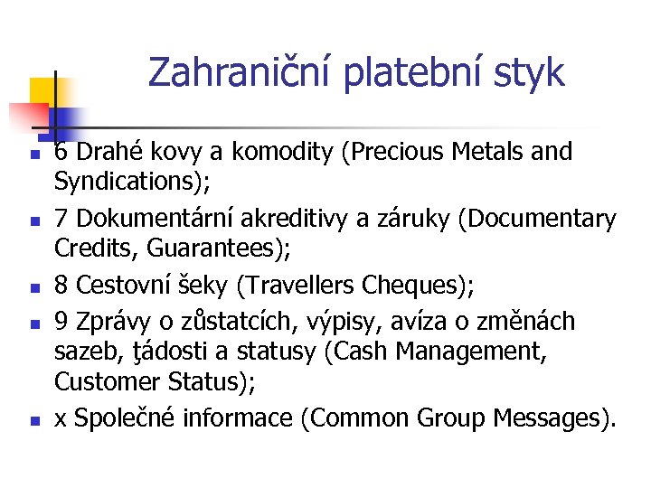 Zahraniční platební styk n n n 6 Drahé kovy a komodity (Precious Metals and Syndications); 7 Dokumentární akreditivy a záruky (Documentary Credits, Guarantees); 8 Cestovní šeky (Travellers Cheques); 9 Zprávy o zůstatcích, výpisy, avíza o změnách sazeb, ţádosti a statusy (Cash Management, Customer Status); x Společné informace (Common Group Messages).
