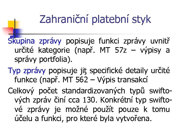 Zahraniční platební styk Skupina zprávy popisuje funkci zprávy uvnitř určité kategorie (např. MT 57 z – výpisy a správy portfolia). Typ zprávy popisuje jiţ specifické detaily určité funkce (např. MT 562 – Výpis transakcí Celkový počet standardizovaných typů swiftových zpráv činí cca 130. Konkrétní typ swiftové zprávy je možné použít pouze k tomu účelu a funkci, pro které byla vytvořena.