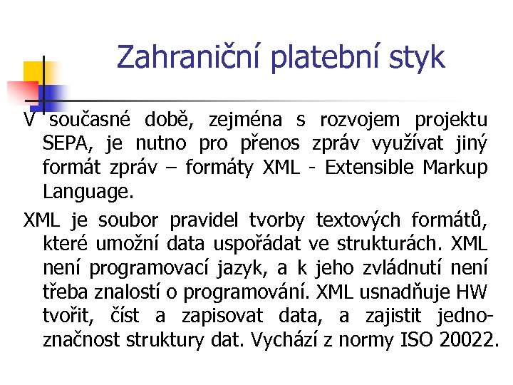 Zahraniční platební styk V současné době, zejména s rozvojem projektu SEPA, je nutno pro přenos zpráv využívat jiný formát zpráv – formáty XML - Extensible Markup Language. XML je soubor pravidel tvorby textových formátů, které umožní data uspořádat ve strukturách. XML není programovací jazyk, a k jeho zvládnutí není třeba znalostí o programování. XML usnadňuje HW tvořit, číst a zapisovat data, a zajistit jednoznačnost struktury dat. Vychází z normy ISO 20022.