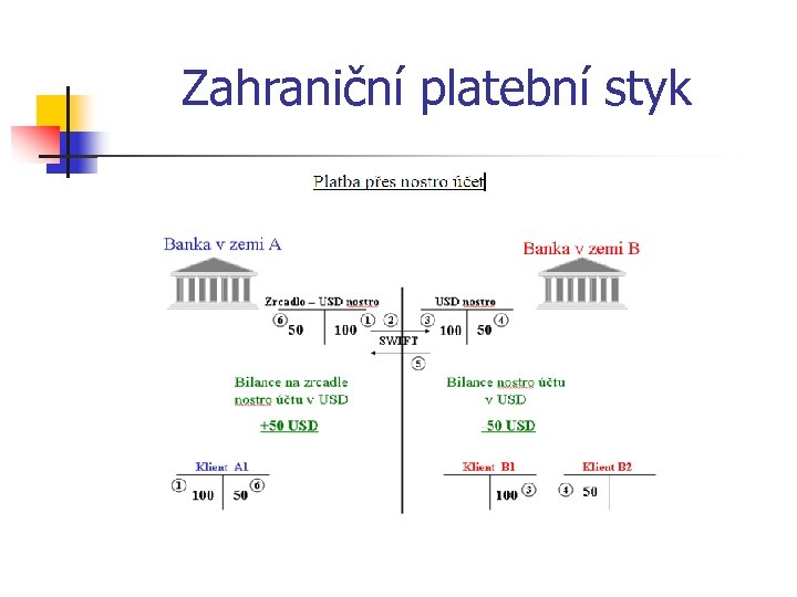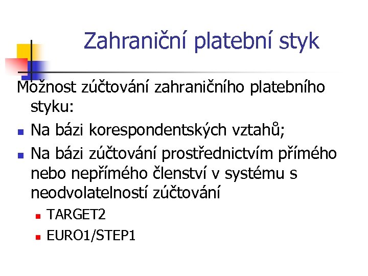 Zahraniční platební styk Možnost zúčtování zahraničního platebního styku: n Na bázi korespondentských vztahů; n Na bázi zúčtování prostřednictvím přímého nebo nepřímého členství v systému s neodvolatelností zúčtování n n TARGET 2 EURO 1/STEP 1