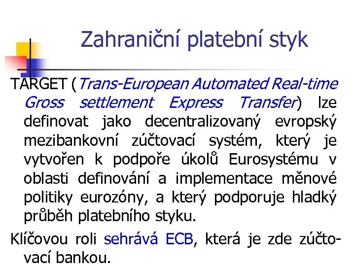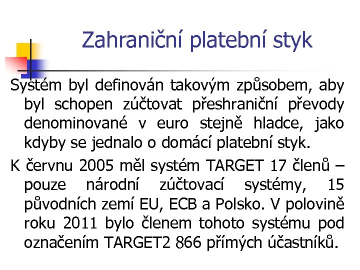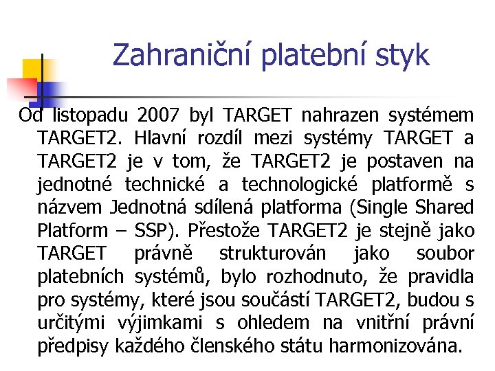 Zahraniční platební styk Od listopadu 2007 byl TARGET nahrazen systémem TARGET 2. Hlavní rozdíl mezi systémy TARGET a TARGET 2 je v tom, že TARGET 2 je postaven na jednotné technické a technologické platformě s názvem Jednotná sdílená platforma (Single Shared Platform – SSP). Přestože TARGET 2 je stejně jako TARGET právně strukturován jako soubor platebních systémů, bylo rozhodnuto, že pravidla pro systémy, které jsou součástí TARGET 2, budou s určitými výjimkami s ohledem na vnitřní právní předpisy každého členského státu harmonizována.