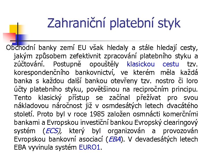 Zahraniční platební styk Obchodní banky zemí EU však hledaly a stále hledají cesty, jakým způsobem zefektivnit zpracování platebního styku a zúčtování. Postupně opouštěly klasickou cestu tzv. korespondenčního bankovnictví, ve kterém měla každá banka s každou další bankou otevřeny tzv. nostro či loro účty platebního styku, povětšinou na recipročním principu. Tento klasický přístup se začínal přežívat pro svou nákladovou náročnost již v osmdesátých letech dvacátého století. Proto byl v roce 1985 založen osmnácti komerčními bankami a Evropskou investiční bankou Evropský clearingový systém (ECS), který byl organizován a provozován Evropskou bankovní asociací (EBA). V devadesátých letech EBA vyvinula systém EURO 1.