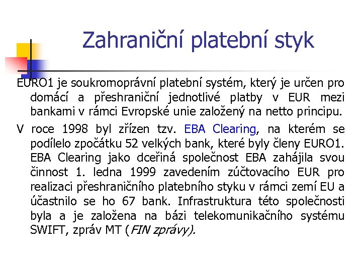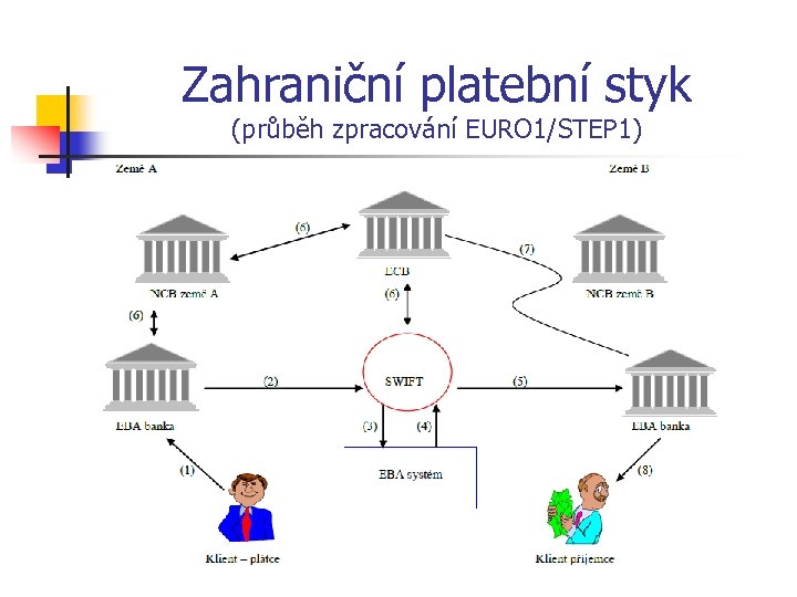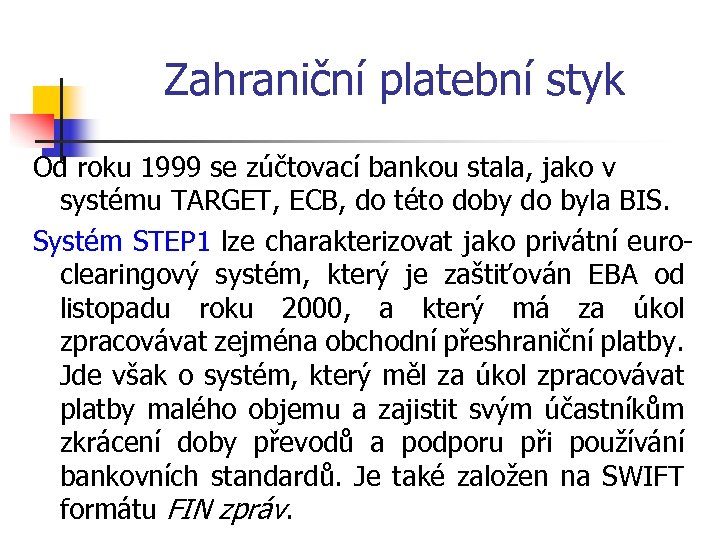 Zahraniční platební styk Od roku 1999 se zúčtovací bankou stala, jako v systému TARGET, ECB, do této doby do byla BIS. Systém STEP 1 lze charakterizovat jako privátní euroclearingový systém, který je zaštiťován EBA od listopadu roku 2000, a který má za úkol zpracovávat zejména obchodní přeshraniční platby. Jde však o systém, který měl za úkol zpracovávat platby malého objemu a zajistit svým účastníkům zkrácení doby převodů a podporu při používání bankovních standardů. Je také založen na SWIFT formátu FIN zpráv.