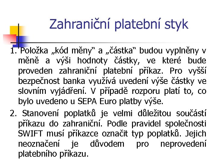 Zahraniční platební styk 1. Položka „kód měny“ a „částka“ budou vyplněny v měně a výši hodnoty částky, ve které bude proveden zahraniční platební příkaz. Pro vyšší bezpečnost banka využívá uvedení výše částky ve slovním vyjádření. V případě rozporu platí to, co bylo uvedeno u SEPA Euro platby výše. 2. Stanovení poplatků je velmi důležitou součástí příkazu do zahraniční. Podle pravidel společnosti SWIFT musí příkazce označit typ poplatků. Jejich neoznačení je důvodem pro neprovedení platebního příkazu.