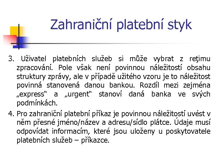Zahraniční platební styk 3. Uživatel platebních služeb si může vybrat z reţimu zpracování. Pole však není povinnou náležitostí obsahu struktury zprávy, ale v případě užitého vzoru je to náležitost povinná stanovená danou bankou. Rozdíl mezi zejména „express“ a „urgent“ stanoví daná banka ve svých podmínkách. 4. Pro zahraniční platební příkaz je povinnou náležitostí uvést v něm přesné jméno/název a adresu/sídlo plátce. Údaje musí odpovídat informacím, které jsou uloženy u poskytovatele platebních služeb – příkazce.